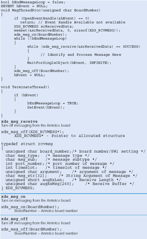缺省情況下Amtelco卡不向應用發(fā)送消息,應用必須調(diào)用sdx_msg_on函數(shù)請求消息發(fā)送。當用應用停止后,需要sdx_msg_off函數(shù)停止發(fā)送消息。(注意:如果運行多個應用監(jiān)控板上消息,確信必須是最后一個應用調(diào)用sdx_msg_off函數(shù))