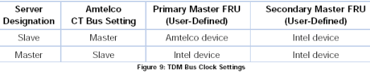 圖9列出了系統(tǒng)中的主控服務器和受控服務器的TDM總線的時鐘設置,