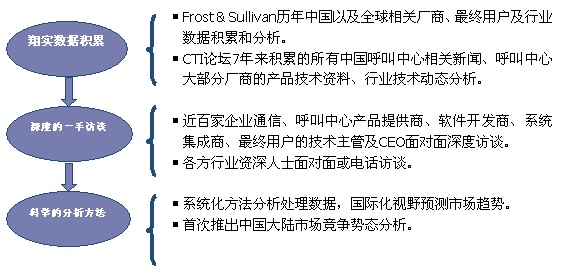 Frost & Sullivan 和 CTI論壇(m.liumsf.cn)共同組成的調(diào)研小組,在查閱了大量資料的基礎(chǔ)之上,以企業(yè)通信及呼叫中心的設(shè)備應(yīng)用、投資計(jì)劃以及相關(guān)廠商的市場(chǎng)表現(xiàn)為出發(fā)點(diǎn),通過(guò)對(duì)企業(yè)通信及呼叫中心重要應(yīng)用企業(yè)、在市場(chǎng)占主導(dǎo)地位的二十多家設(shè)備廠商、二十多家軟件開(kāi)發(fā)商、十幾家系統(tǒng)集成商、數(shù)家外包運(yùn)營(yíng)商的深度訪談,參閱內(nèi)部相關(guān)報(bào)告及數(shù)據(jù)庫(kù),對(duì)數(shù)據(jù)的來(lái)源和數(shù)據(jù)的準(zhǔn)確性進(jìn)行了詳細(xì)核對(duì)與論證;憑借參與調(diào)研人員的多年從業(yè)經(jīng)